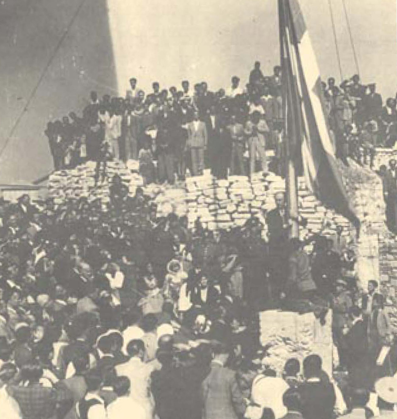 Και βλέπουμε τη γερμανική σημαία σιγά σιγά να υποστέλλεται*, να εξαφανίζεται σαν να την κατάπιε ο Ιερός Βράχος. Και ν' αρχίζει ν'ανεβαίνει στον ιστό το αγαπημένο χρώμα του ουρανού μας. Τα θολωμένα μάτια μου δεν μπορούν πια να δουν. Όταν έχω στεγνώσει βιαστικά τα δάκρυα, η γαλανόλευκη ανεμίζει περήφανα.
